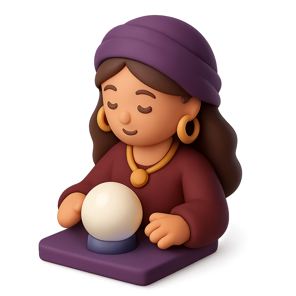 A whimsical 3D fortune teller character with a serene expression, dressed in a purple headscarf and a maroon outfit, gazing at a crystal ball, all set against a soft gradient background.