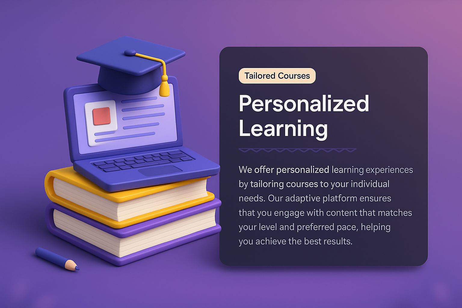 /Collection: /by davooda/Type: PNG/A vibrant 3D illustration showcasing a laptop with a graduation cap, symbolizing personalized learning. The design includes colorful books and a text block, enhancing the educational theme.