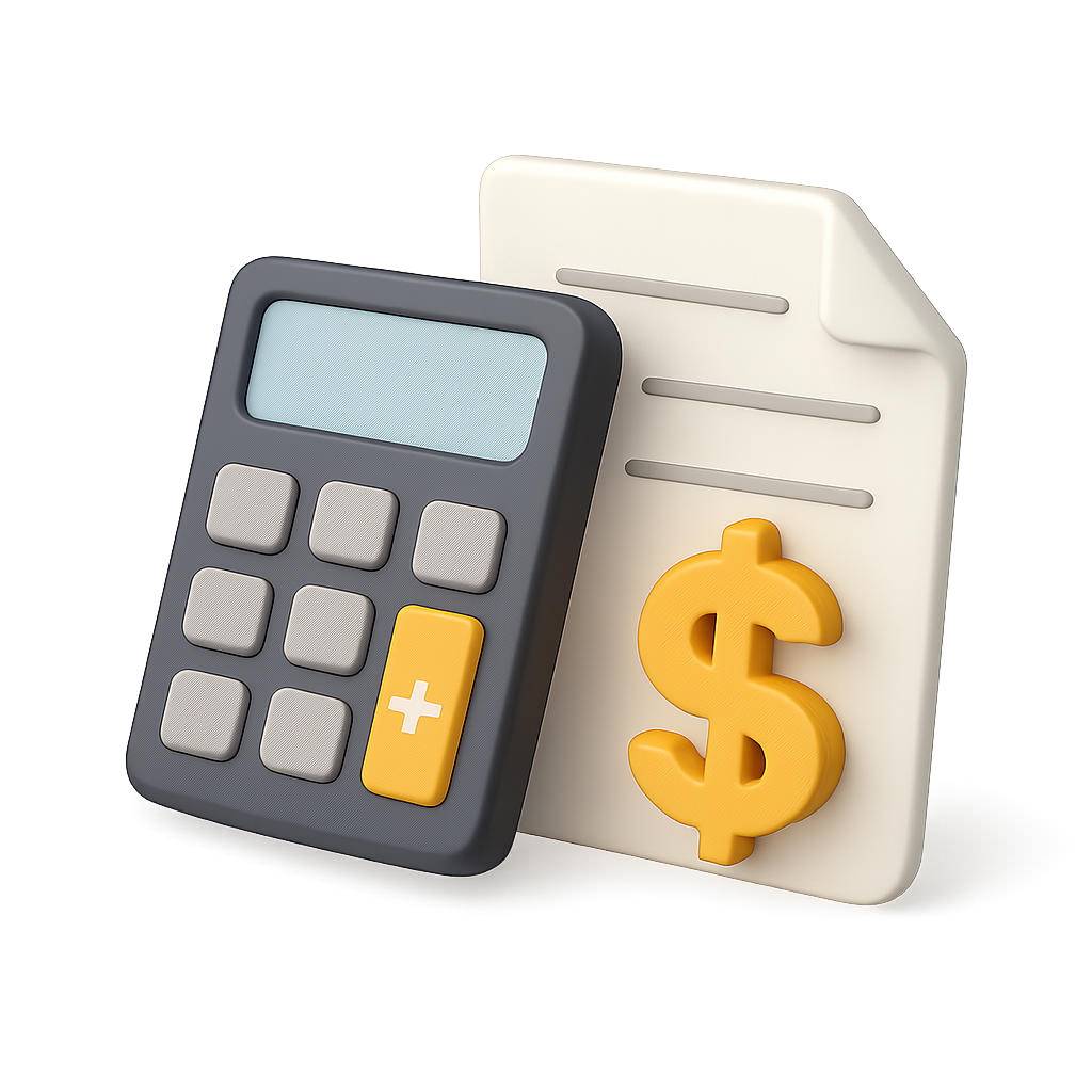 /Collection: /by davooda/Type: PNG/A modern 3D calculator icon alongside a financial document featuring a dollar sign. The design includes a three-quarter view with a sleek, isometric look, emphasizing a volumetric style.