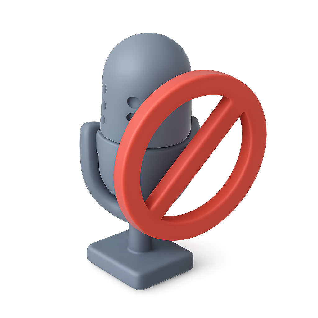 A stylized 3D icon of a microphone with a red slash across it, indicating mute. The design features a transparent background and a three-quarter isometric view, enhancing its volumetric appearance.