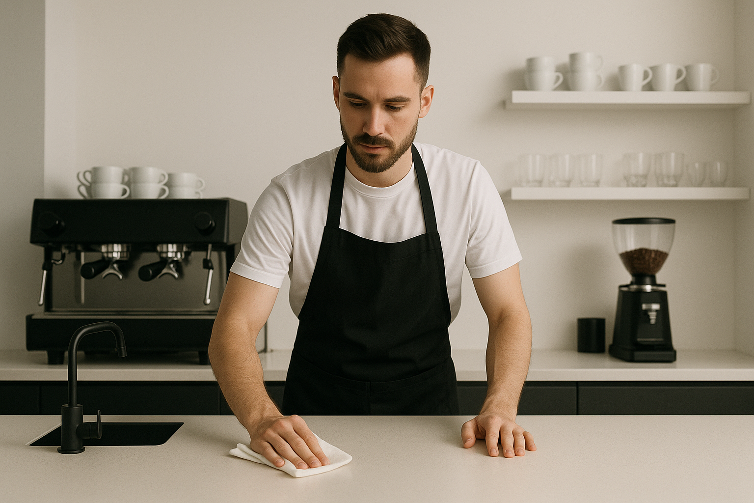 Barista Cleaning a Stylish Counter in Minimalist Cafe
