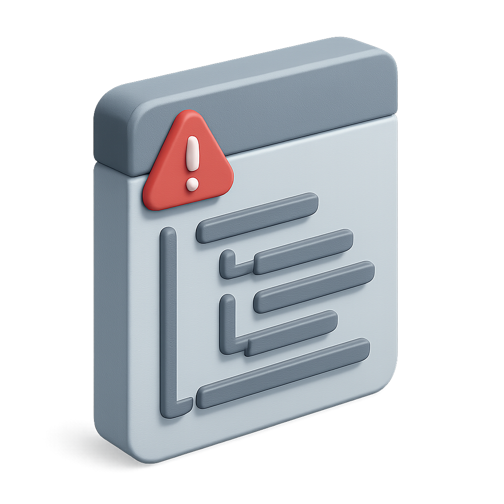 A visually striking 3D stack trace icon featuring a warning symbol. The design includes layered lines and a modern isometric style, set against a transparent background.