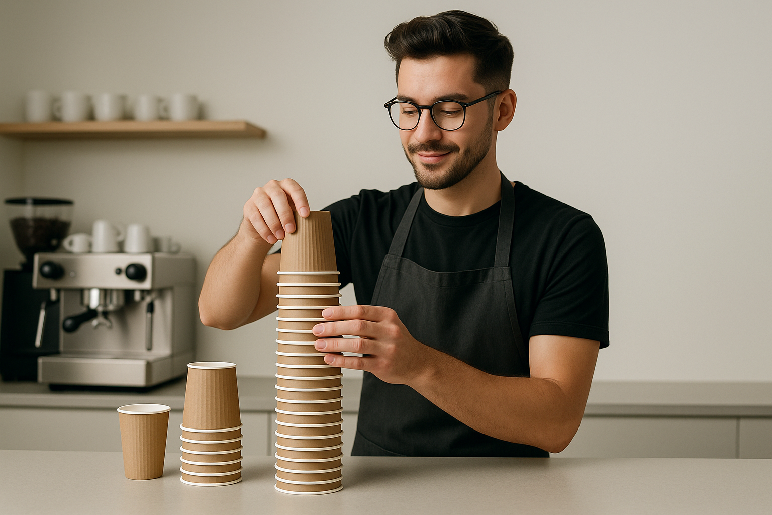 /Collection: /by davooda/Type: PNG/A barista skillfully stacks paper cups in a minimalist setting. The scene is modern and stylish, highlighting the craftsmanship and attention to detail in coffee preparation.