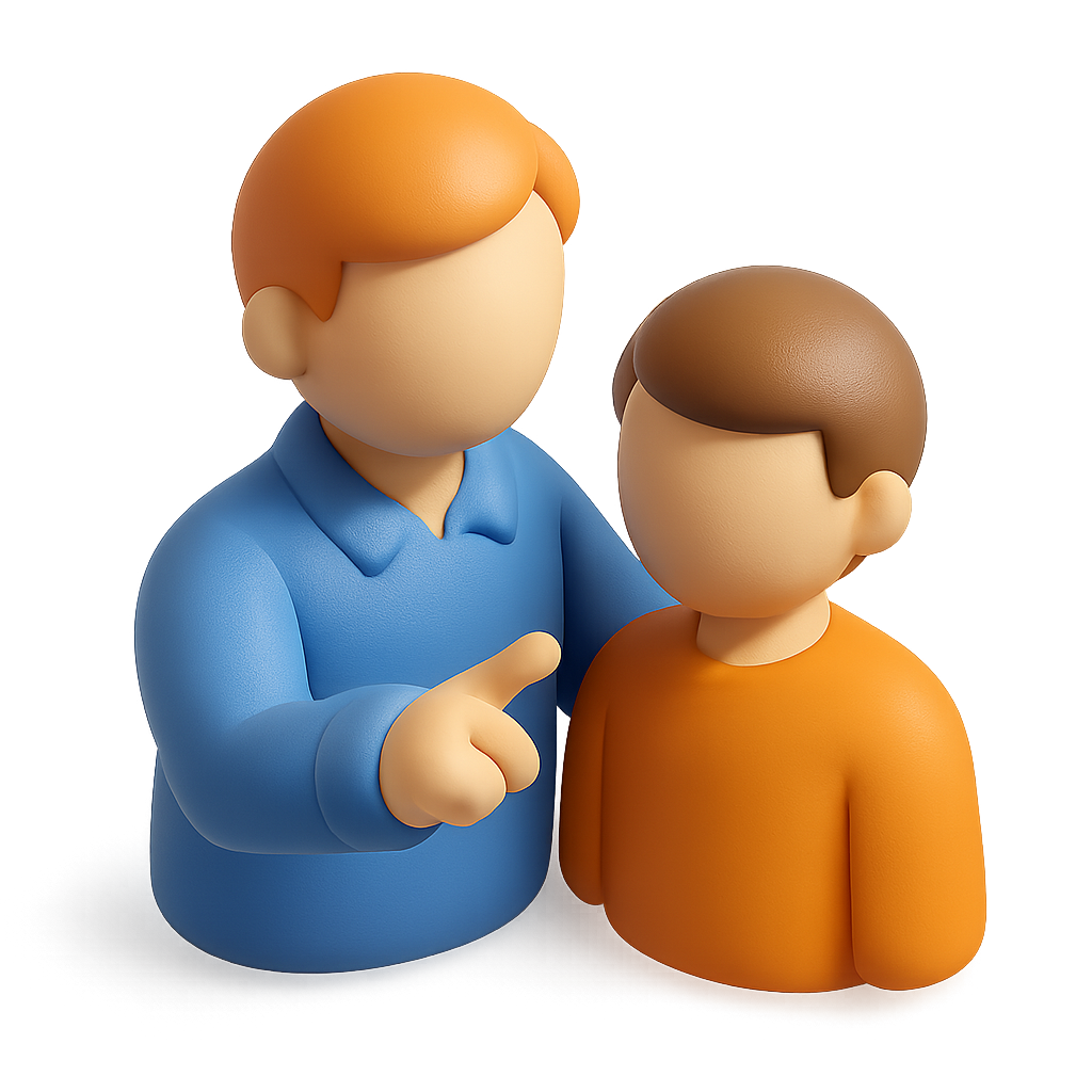 /Collection: /by davooda/Type: PNG/A 3D icon depicting a mentor guiding a younger person. The mentor, wearing a blue shirt, gestures with a finger, while the mentee in an orange shirt listens attentively. The image has a transparent background and a volumetric, isometric design.