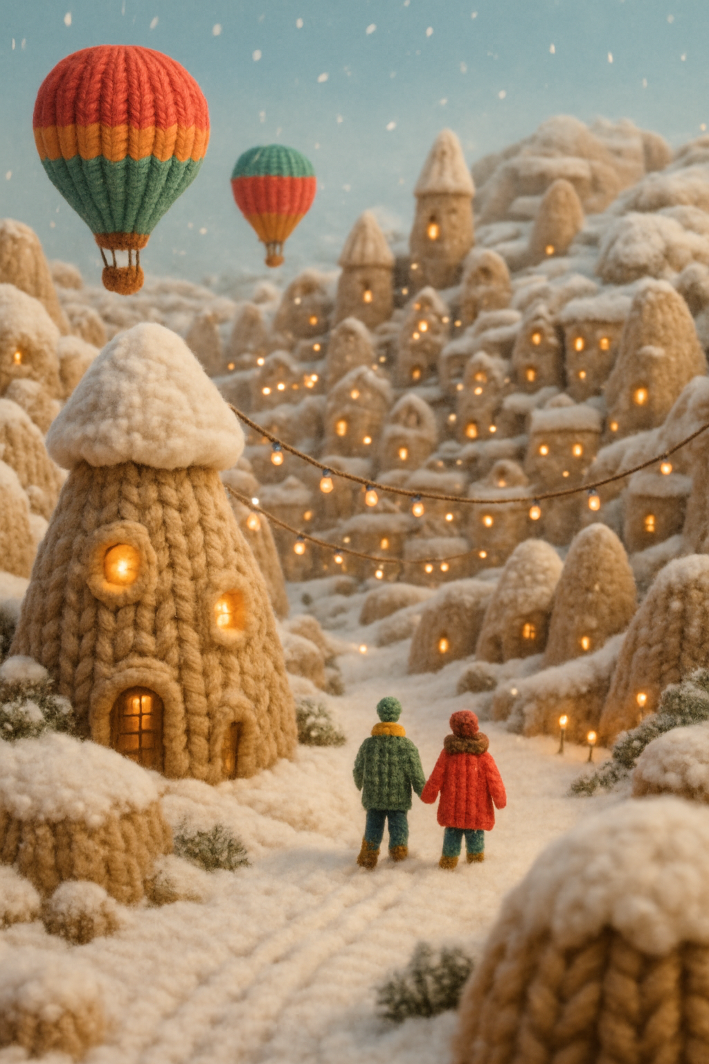 A whimsical 3D scene of Cappadocia, Turkey, featuring knitted-like hills and cozy homes. Two small figures hold hands while snow gently falls and lights twinkle.