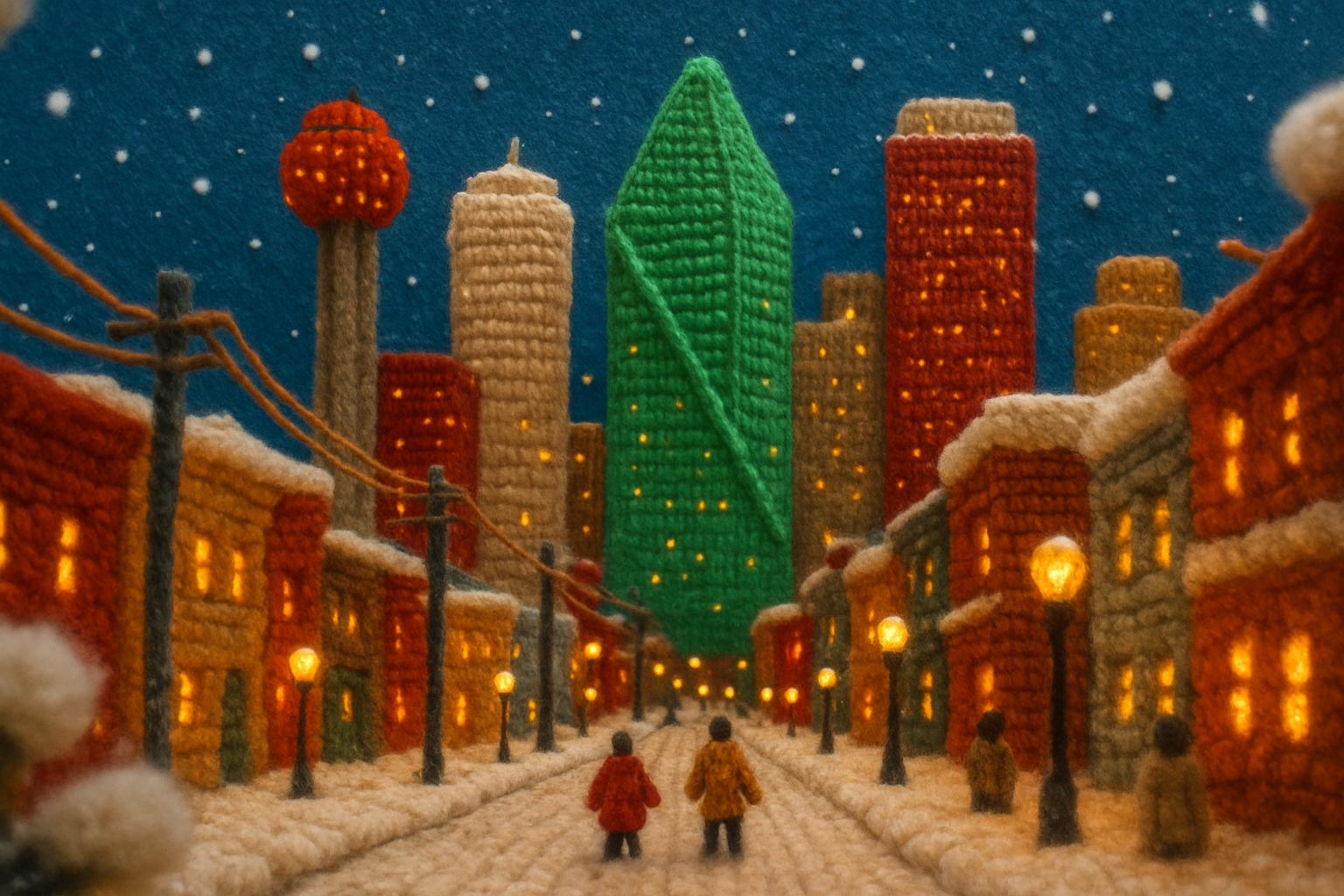 A whimsical depiction of downtown Dallas in winter, featuring buildings made of yarn, soft textures, and a festive atmosphere with falling snowflakes and tiny figures.