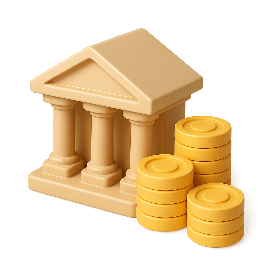 A stylized 3D icon featuring a columned building alongside stacks of golden coins, designed with a transparent background and isometric view, showcasing a volumetric feel.