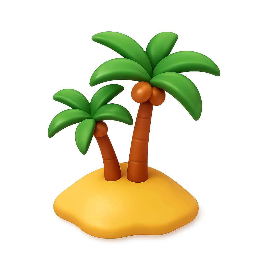 A vibrant, stylized 3D illustration of two palm trees on a small sandy island. The design features a three-quarter view with a smooth, volumetric feel and a transparent background.