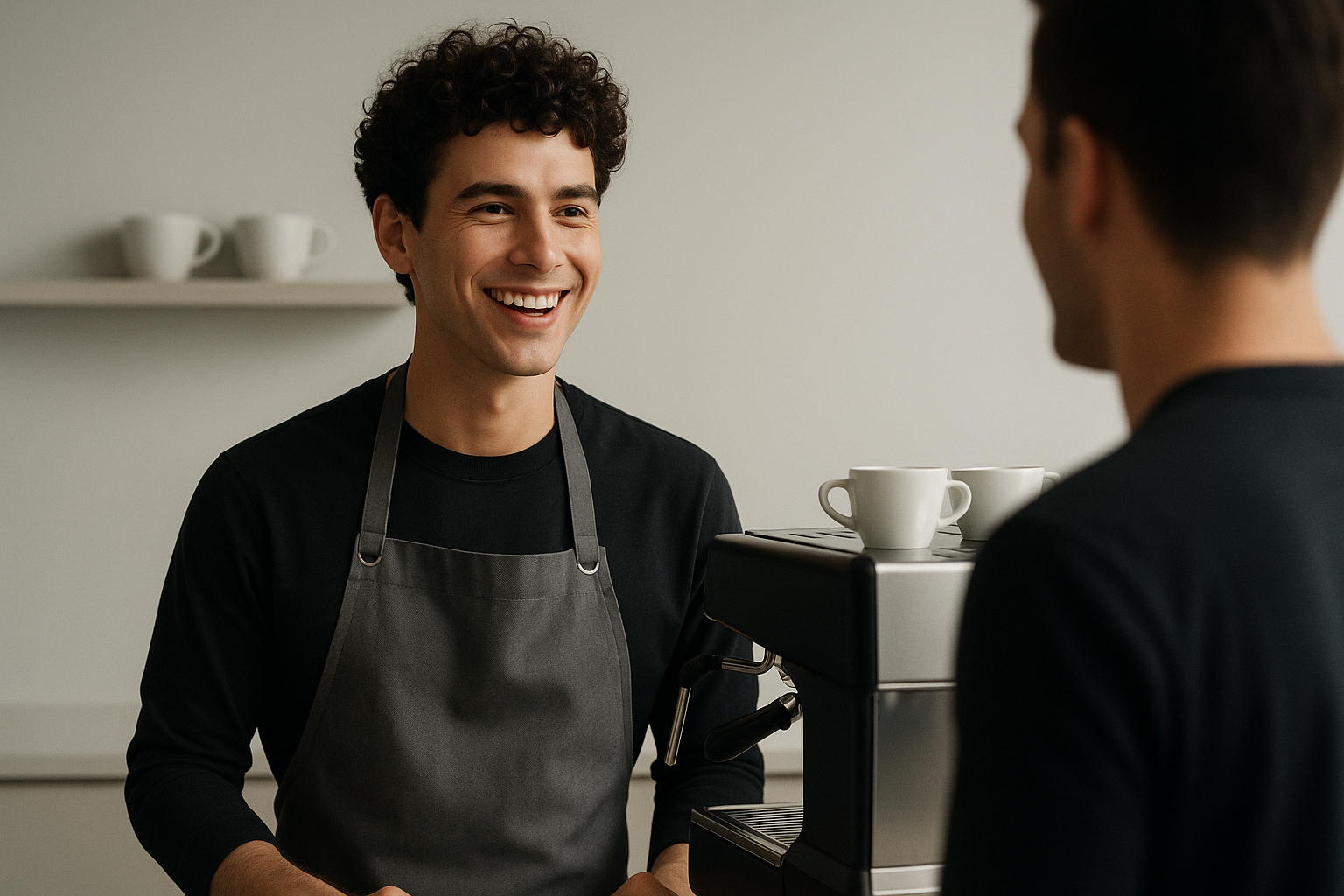 /Collection: /by davooda/Type: PNG/A cheerful barista with curly hair smiles at a customer while standing behind a coffee machine. The minimalist cafe setting features simple decor, enhancing the inviting atmosphere.