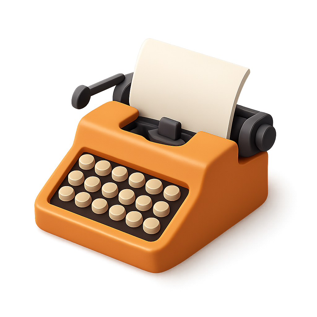 A vibrant 3D representation of a typewriter with a sheet of paper, featuring a three-quarter view. The typewriter has an orange body and beige keys, set against a gradient background.