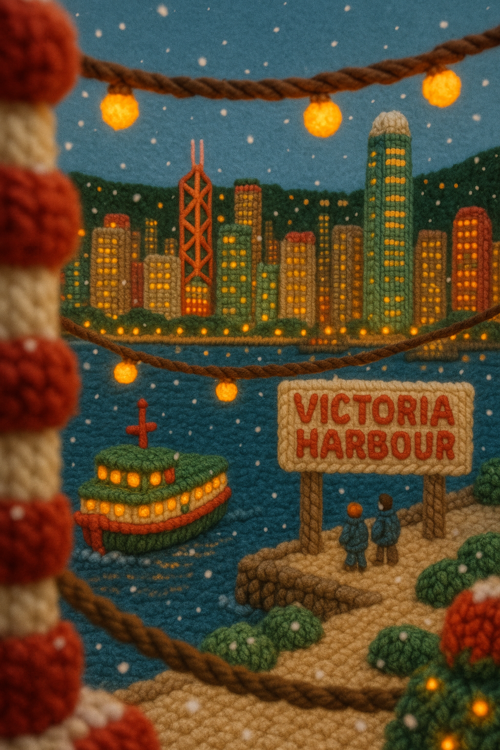 /Collection: /by davooda/Type: PNG/A vibrant depiction of Victoria Harbour, Hong Kong, crafted with yarn-like textures. The scene features a cozy holiday atmosphere with soft colors, snowflakes, and tiny figures, all while city skyscrapers glow in the background.