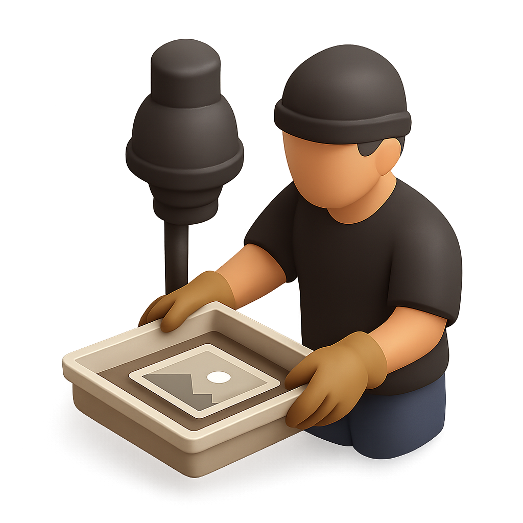 /Collection: /by davooda/Type: PNG/A 3D icon depicting a darkroom technician developing photographs. The character is shown with gloves and a black beanie, working with a photo tray and darkroom equipment, set against a soft, blurred background.