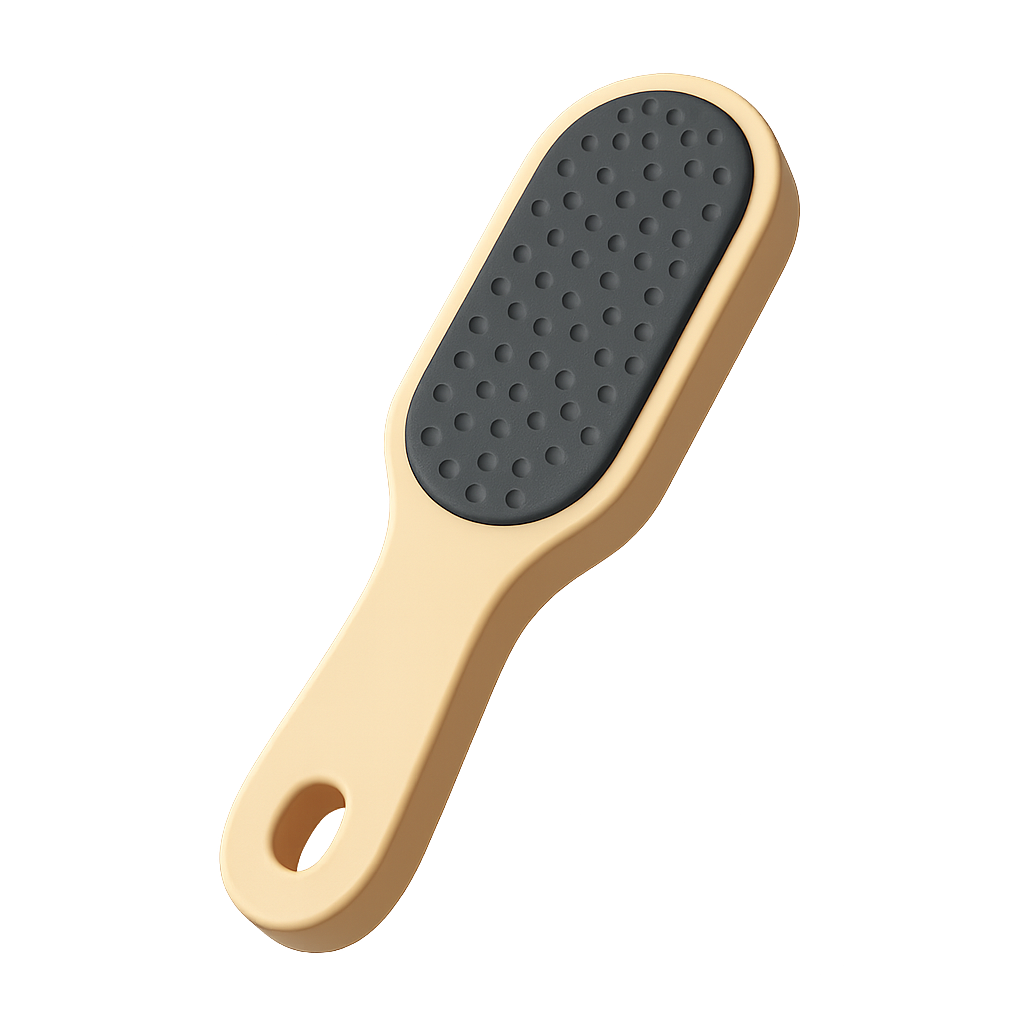 /Collection: /by davooda/Type: PNG/This image features a 3D foot scraper icon designed in a three-quarter view with a modern aesthetic. The scraper has a light yellow handle and a textured black surface.