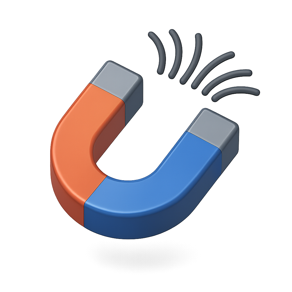 /Collection: /by davooda/Type: PNG/A stylized 3D magnet icon depicted in a three-quarter view, featuring blue and orange colors. Magnetic field lines are illustrated above, enhancing the 3D effect.