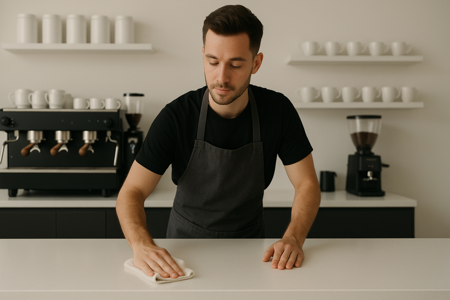 Stylish Barista Cleaning a Minimalist Countertop