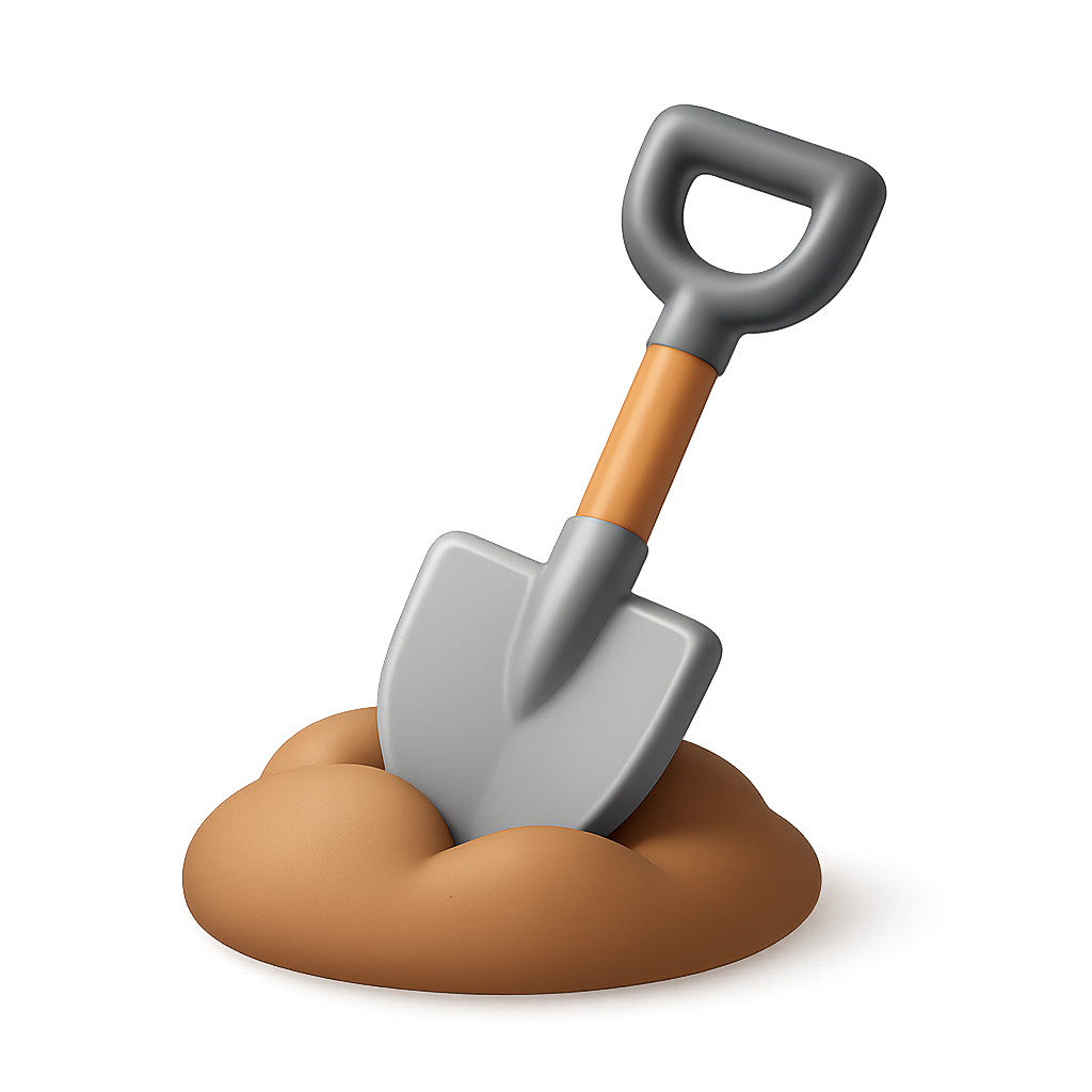 A vibrant 3D icon of a shovel embedded in a mound of dirt, featuring a metallic blade and an orange handle. The design has a volumetric and isometric feel, with a transparent background.