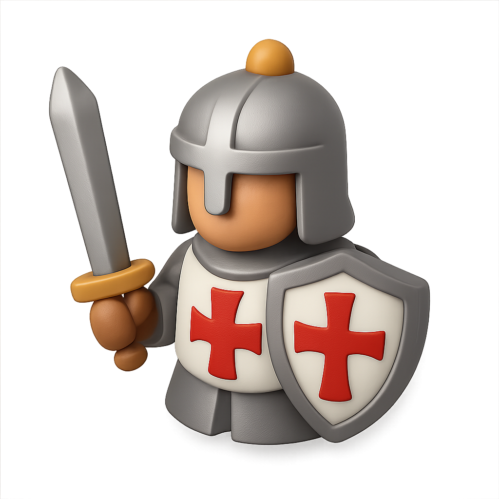 /Collection: /by davooda/Type: PNG/A stylized 3D knight in medieval armor, holding a sword and shield. The knight features a helmet and a tunic adorned with red crosses, rendered in a three-quarter view.