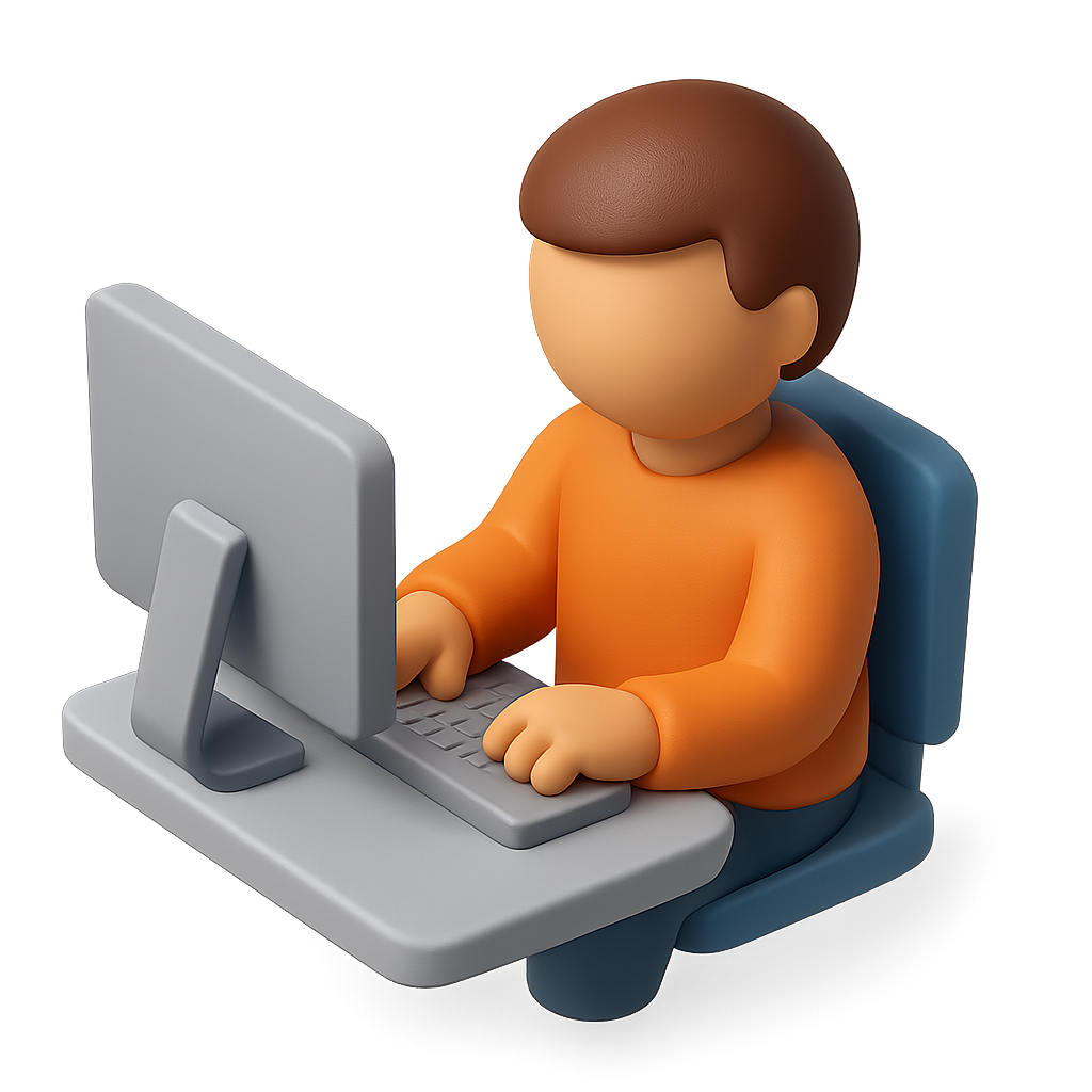 A stylized 3D isometric icon featuring a person seated at a computer, depicted in a three-quarter view. The character is shown in an orange shirt with a modern chair and desk setup.