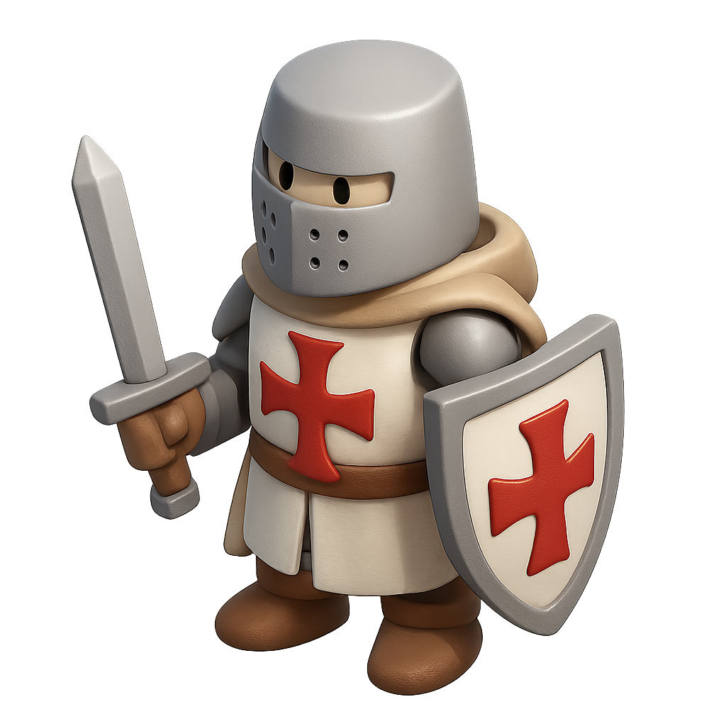 /Collection: /by davooda/Type: PNG/A stylized 3D knight figure in a three-quarter view. The knight wears a helmet, chainmail, and a tunic adorned with a red cross. He holds a sword in one hand and a shield in the other, showcasing a playful yet heroic design.