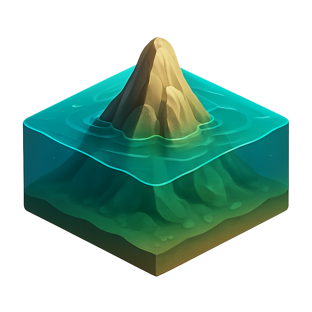 /Collection: /by davooda/Type: PNG/A visually striking isometric 3D representation of an underwater seamount, with a clean flat base and vibrant colors. The object appears to levitate above a blue and green water surface, ideal for game assets.