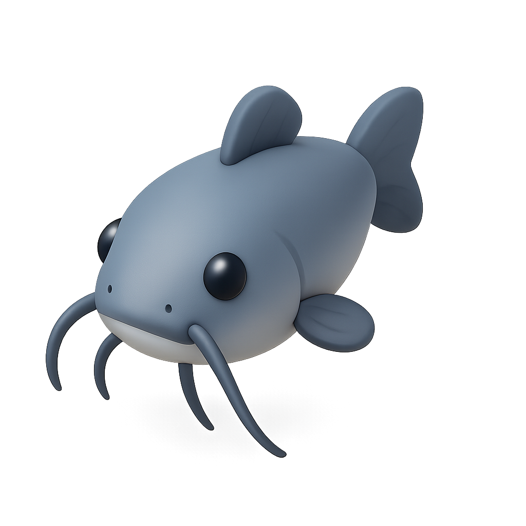 /Collection: /by davooda/Type: PNG/A stylized 3D icon of a catfish featuring prominent whiskers, designed with a three-quarter view. The icon has a soft color palette and a volumetric feel, set against a transparent background.