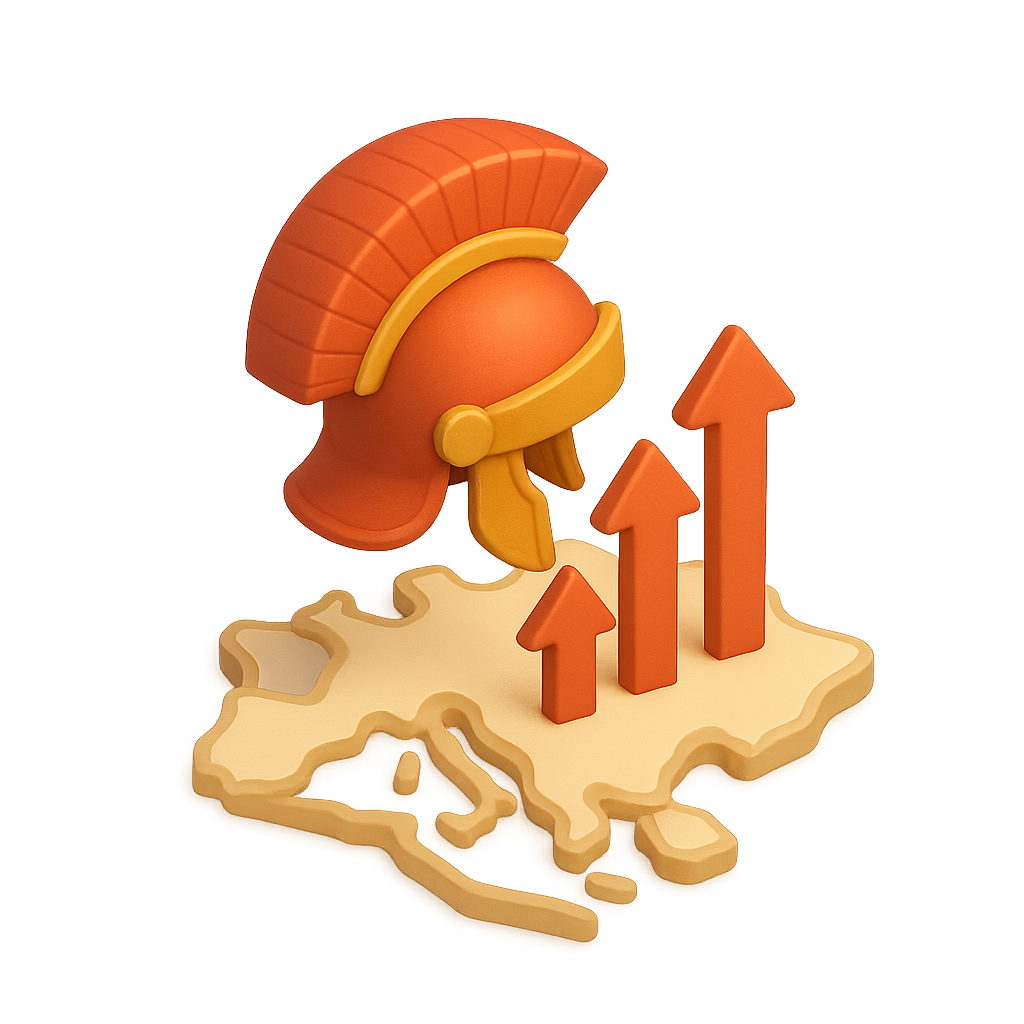 A 3D icon featuring a Roman helmet on a map of Europe, with upward arrows symbolizing expansion. The design is isometric and volumetric, showcasing a transparent background.