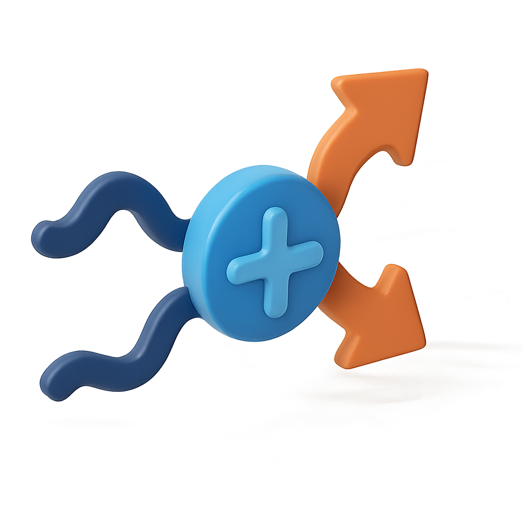 /Collection: /by davooda/Type: PNG/This image features two diverging arrows in vibrant orange and blue colors, accompanied by a wavy line and a plus sign in the center. The design has a 3D isometric feel, set against a subtle background.