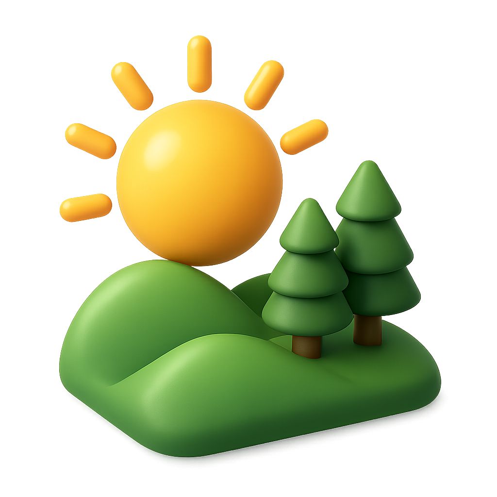 A vibrant isometric 3D sun icon is depicted above stylized green hills with two trees. The sun features a glossy finish, casting a warm glow, creating a playful and cheerful atmosphere.