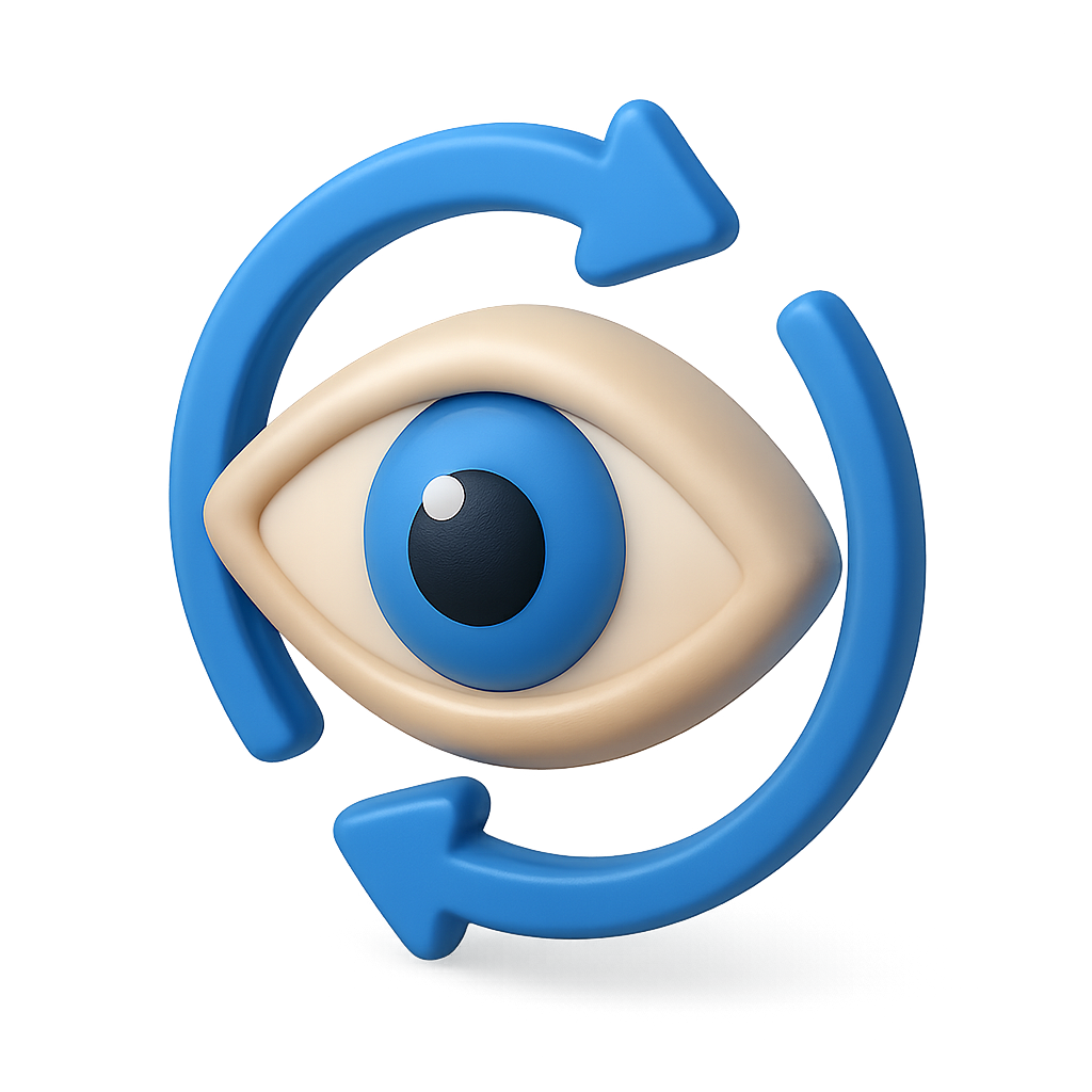 A modern 3D icon featuring an eye encircled by two curved arrows, emphasizing a dynamic and engaging look. The design showcases a blend of blue and beige tones.
