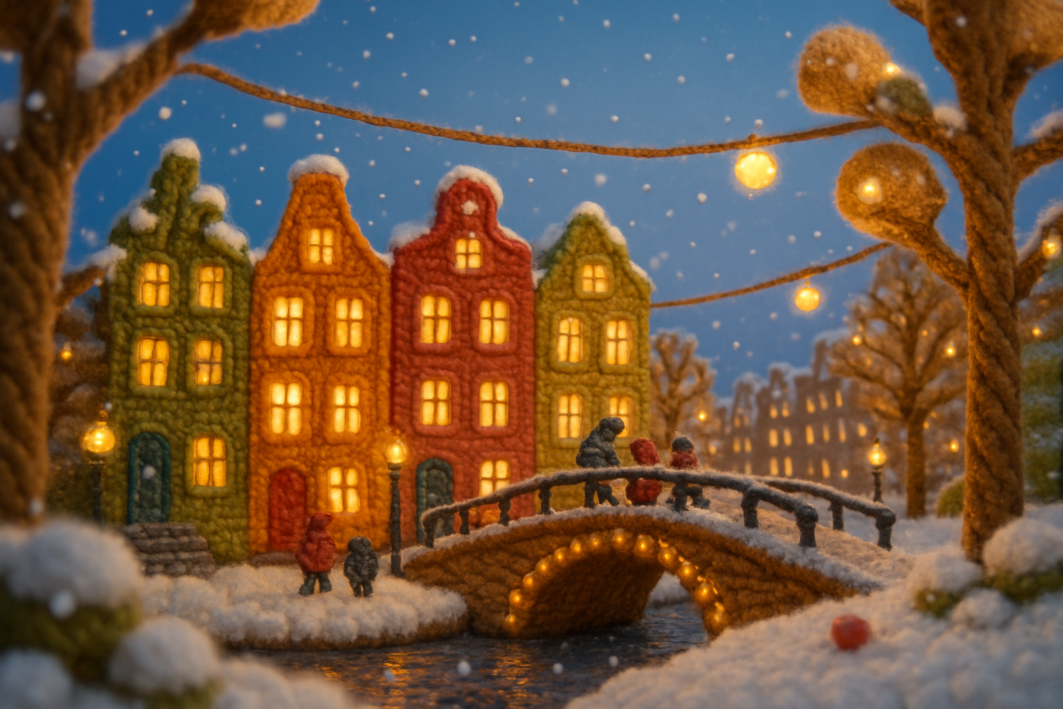 /Collection: /by davooda/Type: PNG/A charming 3D wool scene depicting Amsterdam's colorful houses under a snowy sky. The foreground features snowflakes and warm lights, while small figures stroll across a bridge, creating a festive atmosphere.