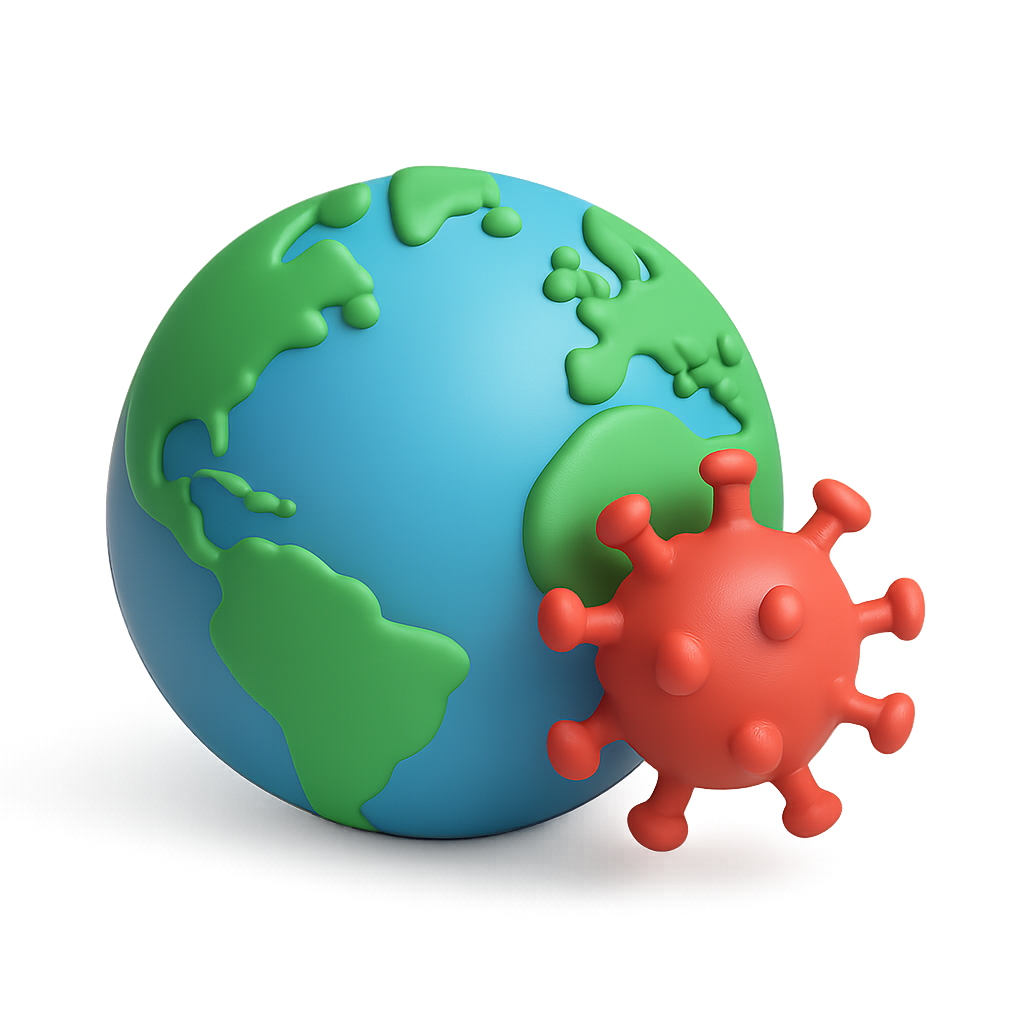A stylized 3D globe depicting continents in green and a red virus structure. The design features a three-quarter view with a transparent background, emphasizing a modern isometric aesthetic.