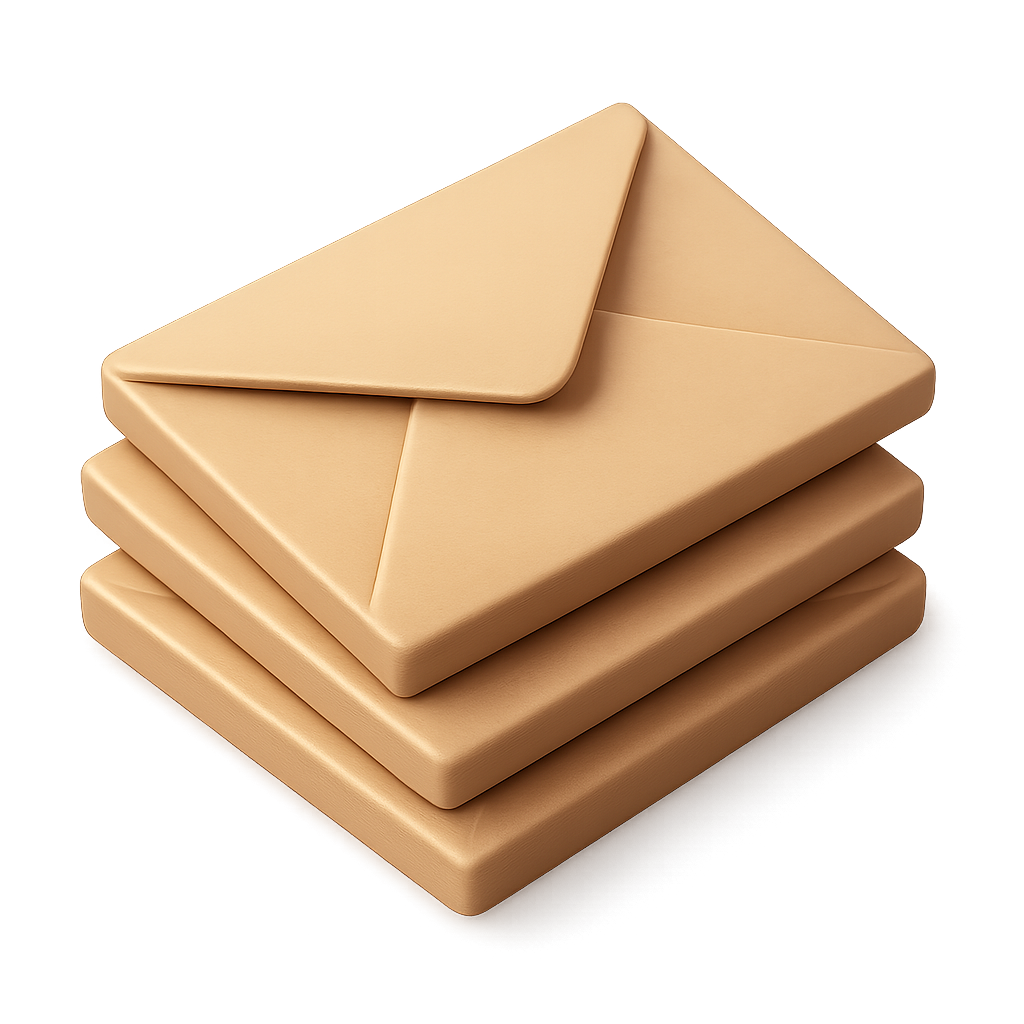 A visually appealing 3D icon featuring three envelopes stacked neatly, designed with a smooth texture and a soft color palette, presented in an isometric view.