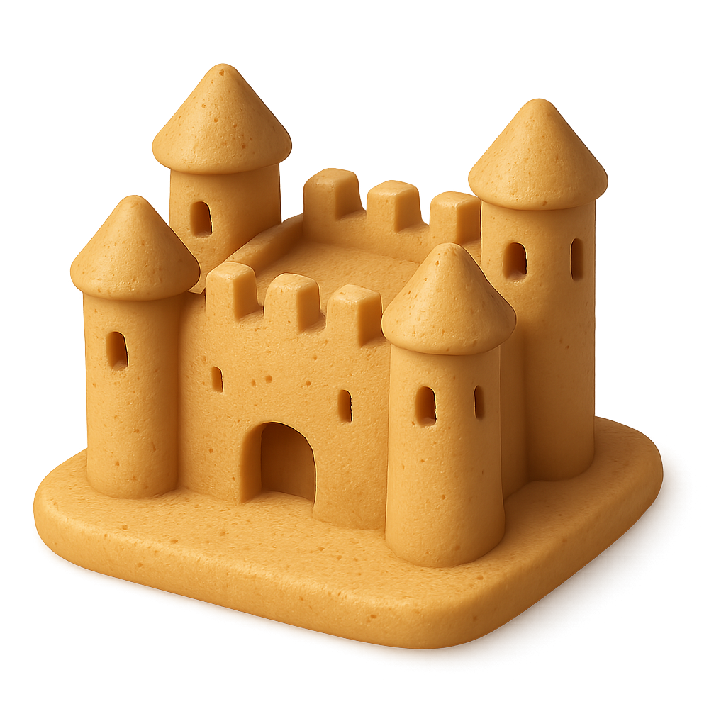 A charming 3D icon of a sandcastle featuring multiple towers and a main entrance. The design showcases a soft, volumetric appearance with a warm, golden background.