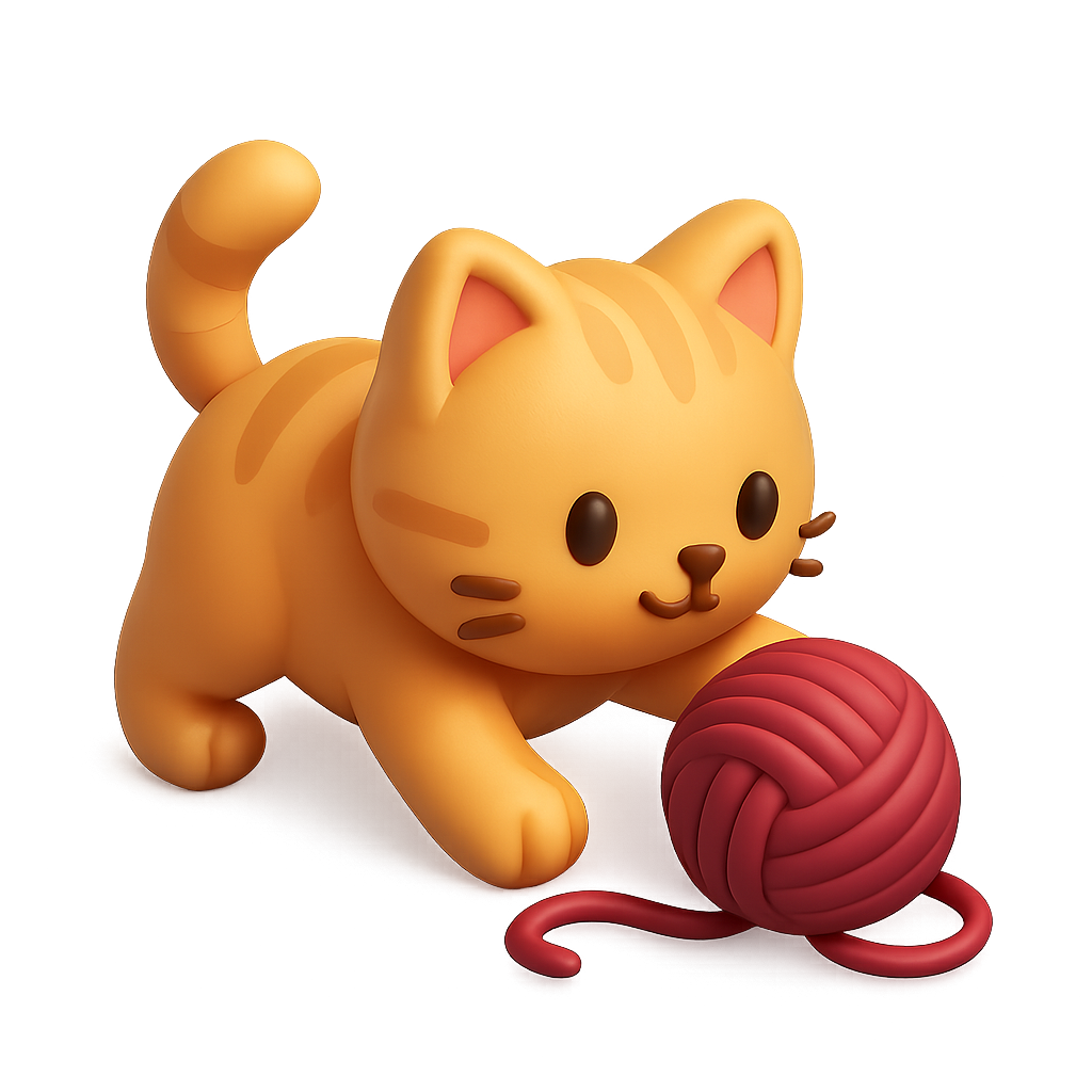 A cute 3D rendered kitten with orange stripes, playfully engaging with a red yarn ball. The design emphasizes a glossy and volumetric style on a soft gradient background.