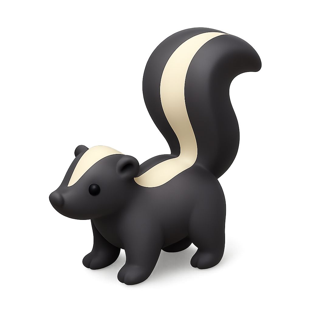 /Collection: /by davooda/Type: PNG/A stylized, isometric 3D icon of a skunk with a raised tail, featuring a black body and white stripes. The design emphasizes a playful, cartoonish appeal against a subtle background.