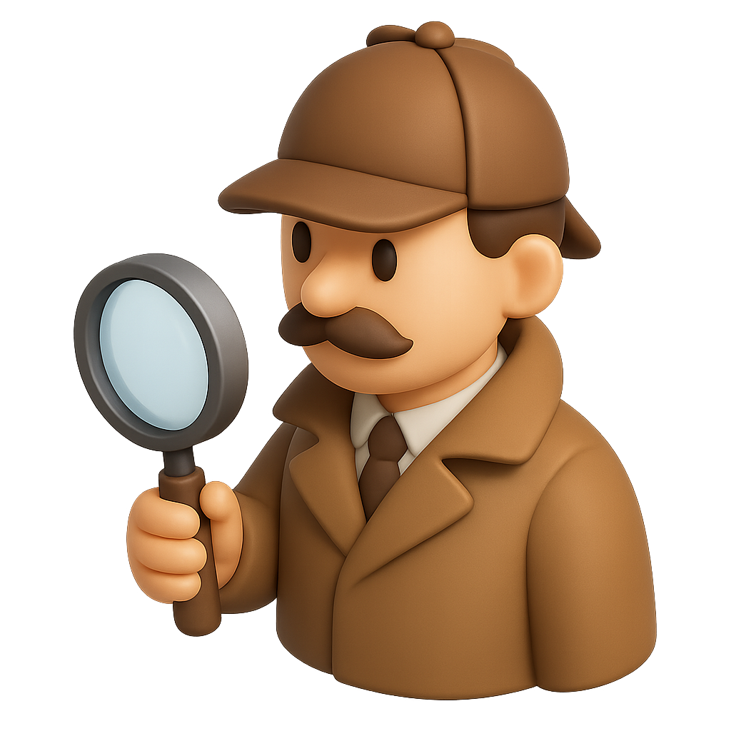 /Collection: /by davooda/Type: PNG/A charming 3D icon of a detective holding a magnifying glass, featuring a brown hat and coat. The design has a transparent background and is rendered in a three-quarter view, giving it a volumetric and isometric appearance.