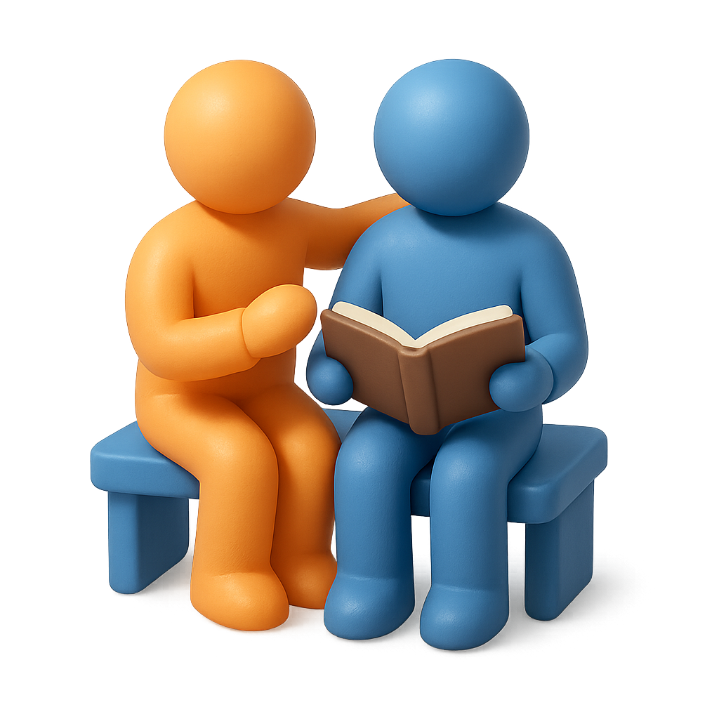 A 3D icon depicting two figures, one orange and one blue, engaged in mentorship. The orange figure supports the blue figure holding a book, set on a simple bench.