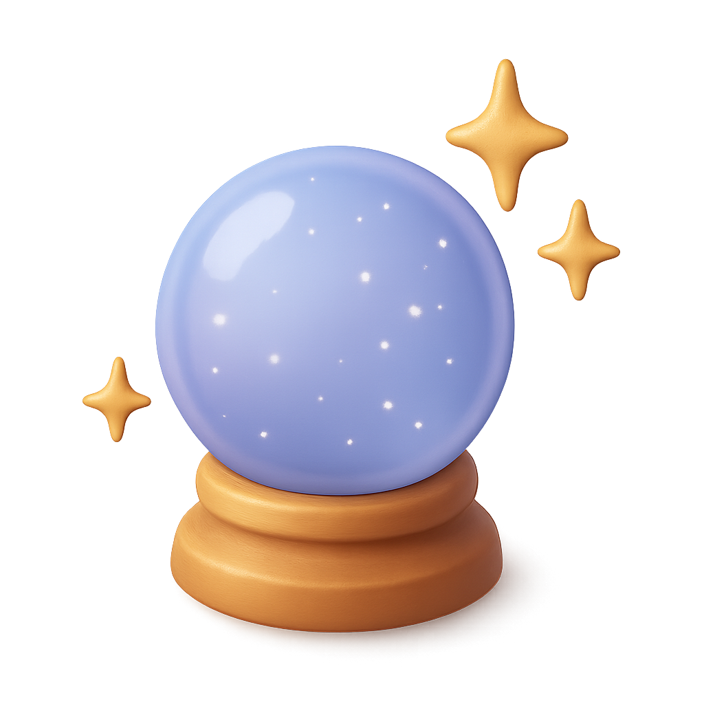 A beautifully designed crystal ball with sparkles, displayed in a three-quarter isometric view. The ball has a translucent appearance, set on a wooden base, surrounded by glimmering stars.
