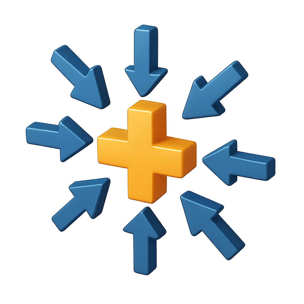 A 3D representation of multiple arrows converging towards a central plus symbol, showcasing a volumetric and isometric design with a transparent background.