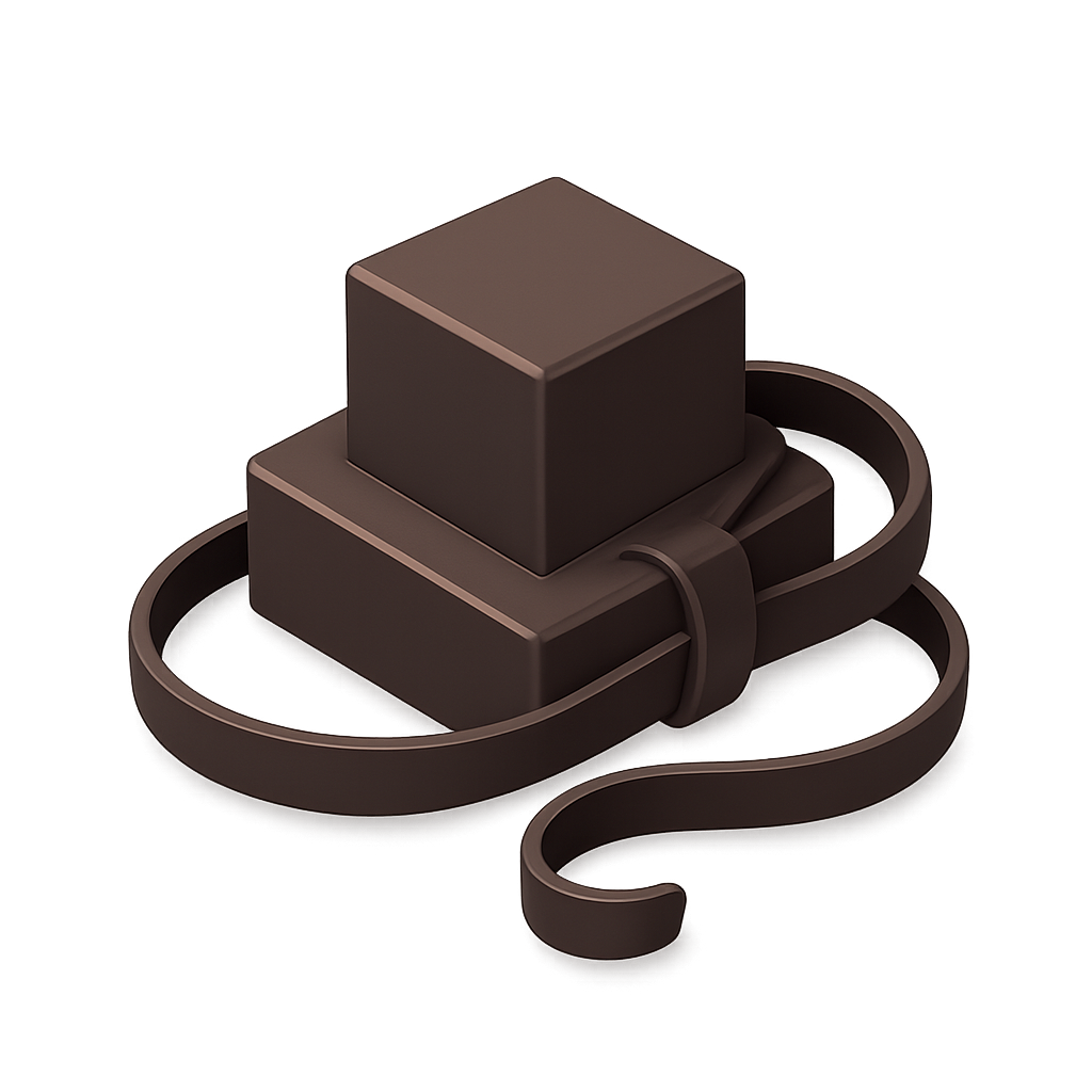 A stylized 3D representation of tefillin, featuring a two-box configuration and a curled strap. The design is presented in a three-quarter view with a smooth, volumetric finish.