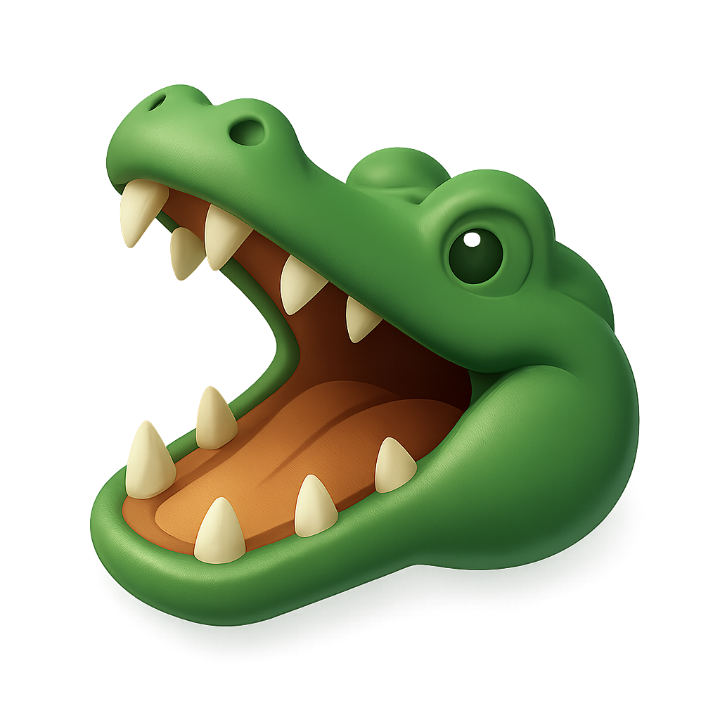 /Collection: /by davooda/Type: PNG/A vibrant 3D crocodile icon featuring an open mouth with sharp teeth, designed in a three-quarter isometric view. The crocodile has a glossy green texture against a soft blurred background.