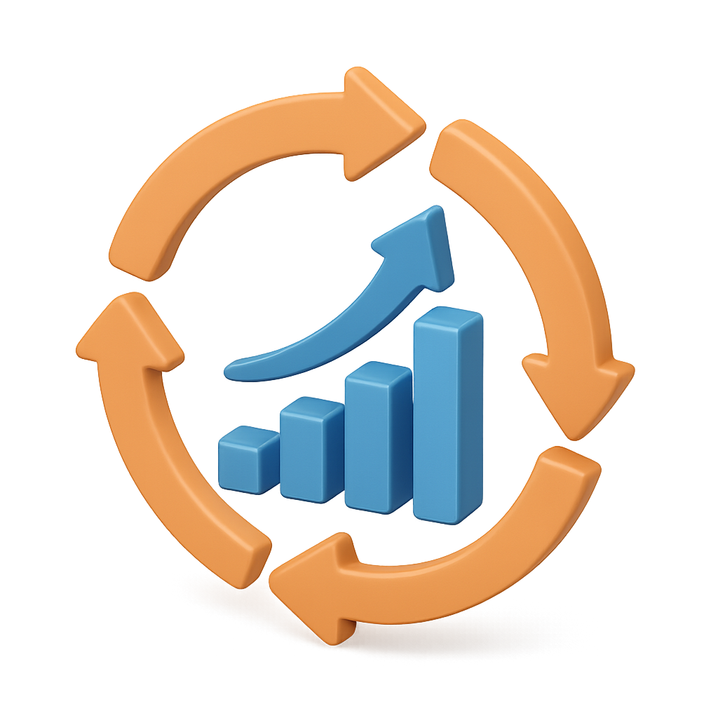 /Collection: /by davooda/Type: PNG/This image features a 3D icon representing a continuous improvement cycle, showcasing a bar graph and arrows in a three-quarter view with a transparent background.