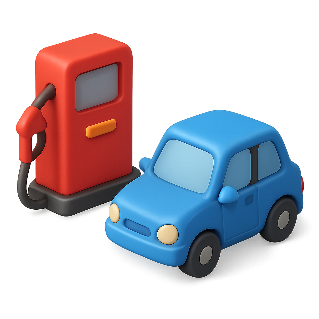 A colorful 3D illustration featuring a red fuel pump and a blue car. The design is simple, with a transparent background and a volumetric isometric perspective.