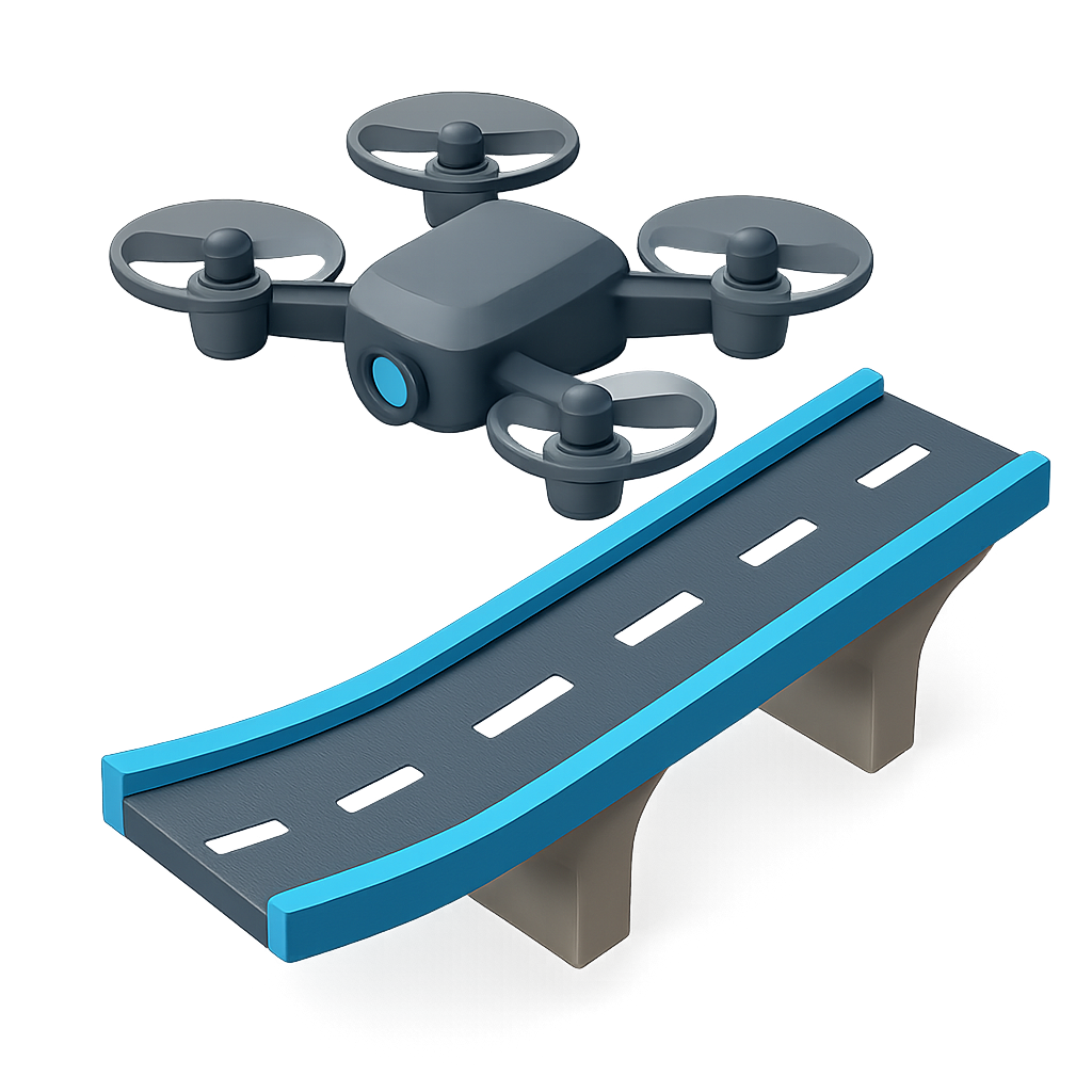 An artistic 3D representation of a drone positioned above a curved highway corridor. The design features a transparent background, emphasizing the drone and road's isometric and volumetric characteristics.