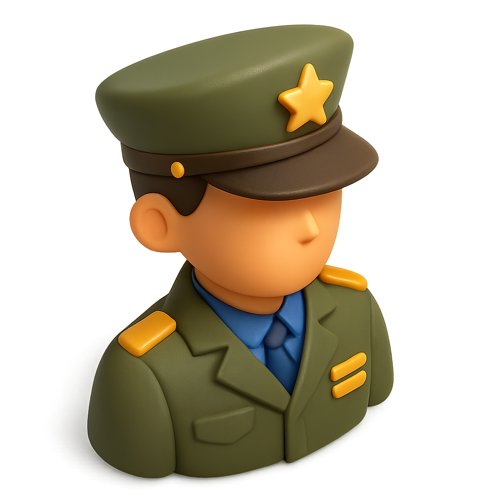 A stylized 3D icon of a cadet in training, featuring a military cap and uniform. The design is isometric with a transparent background, highlighting a modern and simplistic aesthetic.