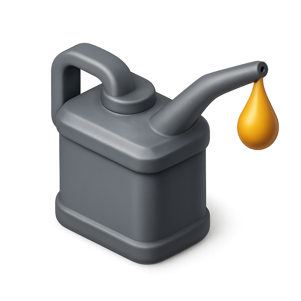 A sleek, 3D-rendered oil can featuring a drip, presented in a three-quarter isometric view with a transparent background. The design emphasizes volumetric shapes and subtle details.