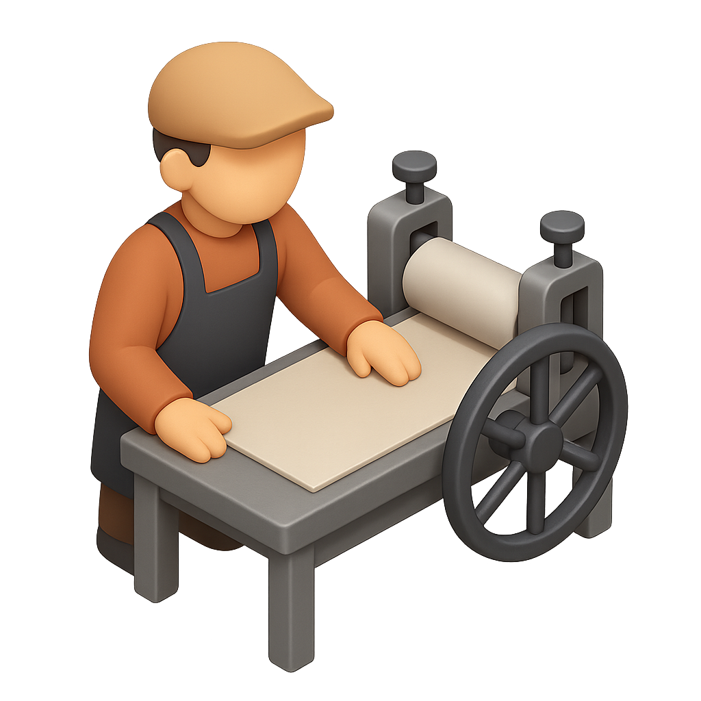 A 3D icon of a printmaker operating a press, depicted in a three-quarter isometric view with a transparent background. The figure wears a cap and apron, showcasing a detailed printing press.