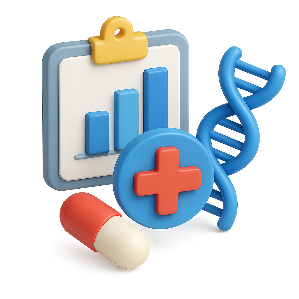 /Collection: /by davooda/Type: PNG/A visually appealing 3D icon representing medical achievements, featuring a bar graph, a red cross, a DNA helix, and a capsule, all designed with a modern isometric style.