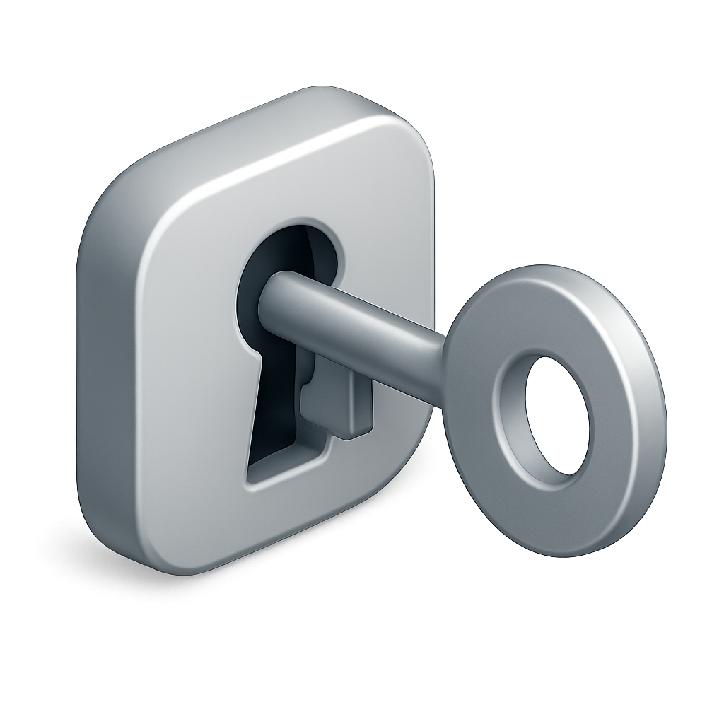 A sleek 3D representation of a keyhole with a metallic key inserted, featuring a transparent background. The icon showcases a three-quarter view with volumetric depth.