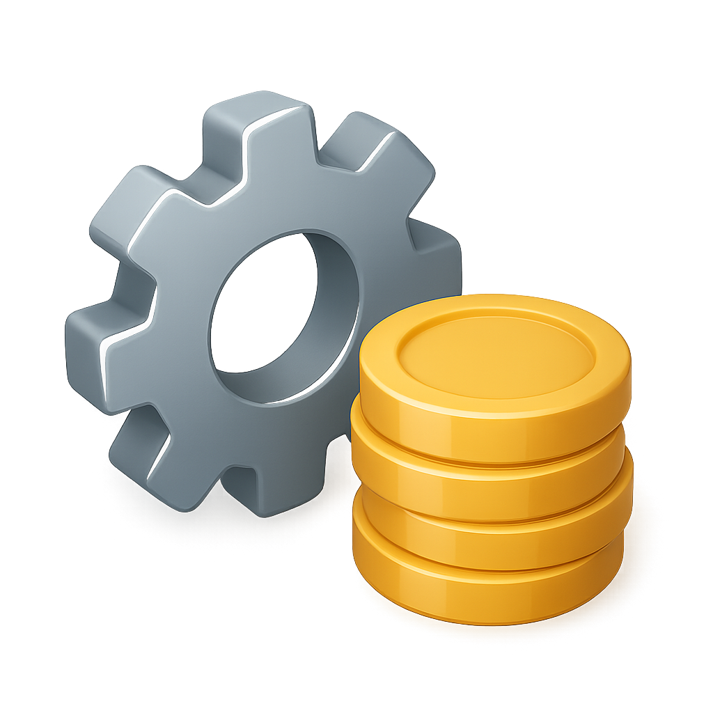 3D Gear Icon Next to Stacked Coins in Isometric View